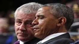 «هيجل» يفتح النار على «أوباما» بسبب سوريا Outgoing U.S. Defense Secretary Chuck Hagel looks at President Barack Obama during a farewell ceremony at شن وزير الدفاع الأمريكي السابق تشاك ...