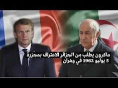 ماكرون يطلب من الجزائر الاعتراف بمجزرة 5 يوليو 1962 في وهران - YouTube اعترف الرئيس الفرنسي ايمانويل ماكرون بمسؤولية الجمهورية الفرنسية في حادث إطلاق نار استهدف فرنسيي الجزائر في آذار/ مارس عام 1962 وطالب الدولة ...